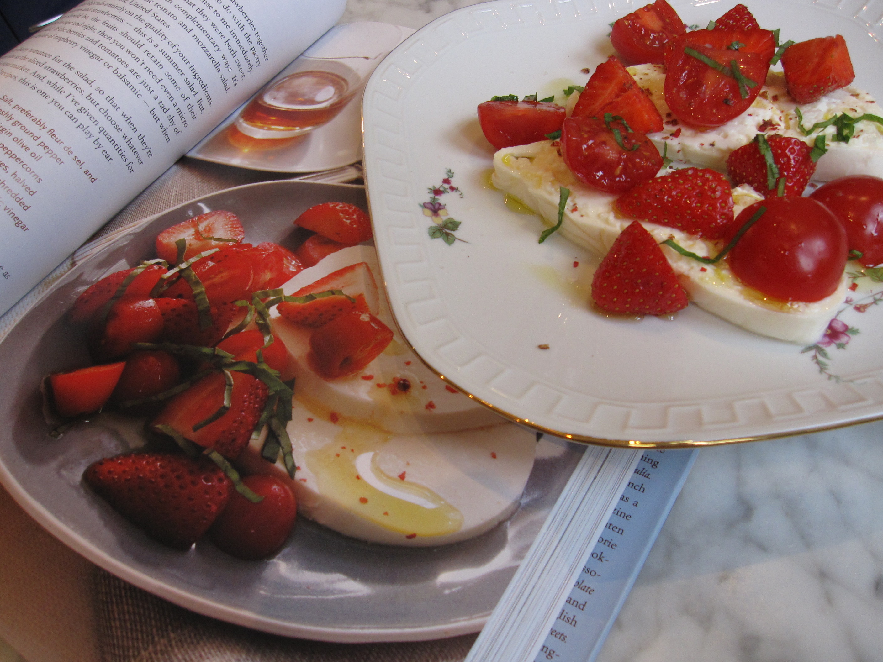 Well, anyway, let’s start with the homemade herbed goat cheese. I did manage to find goat yogurt without too much searching and I started this recipe by setting the yogurt to strain. Considering that it was greek yogurt, I was surprised to see that I still had quite a bit of water drain out. While this was happening, I also made the oven-roasted cherry tomatoes. This is an old favorite which I make fairly often. Depending on my mood I’ll either use Nigella’s “moon blush” tomatoes or Dorie’s classic version. David’s version was equally delicious and also quick and easy to put together.