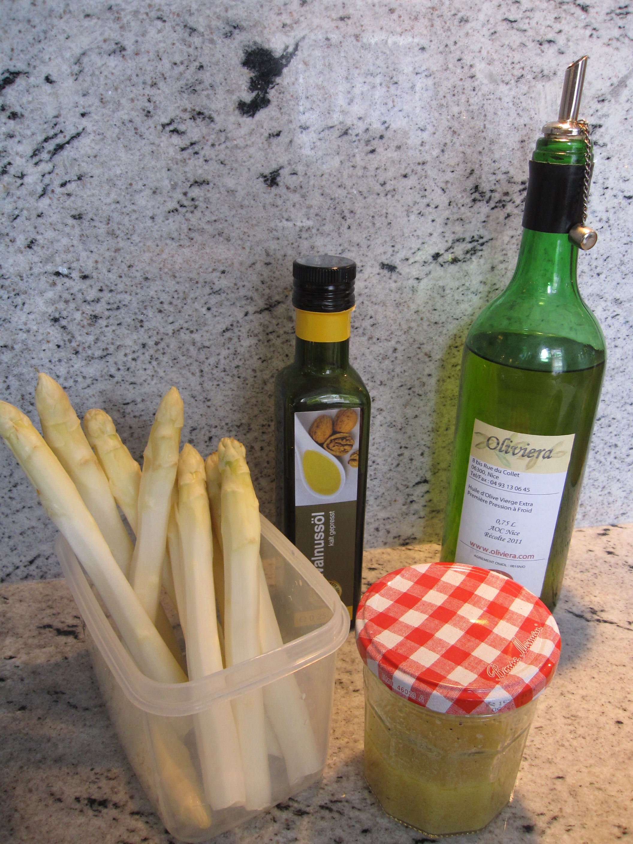 German asparagus is white, or occasionally purplish, but rarely green. On my latest trip to the market I found a nice pile of fresh plump locally grown white asparagus, and one or two lonely bundles of tired looking green asparagus which had been imported from Mexico. My choice was an easy one.