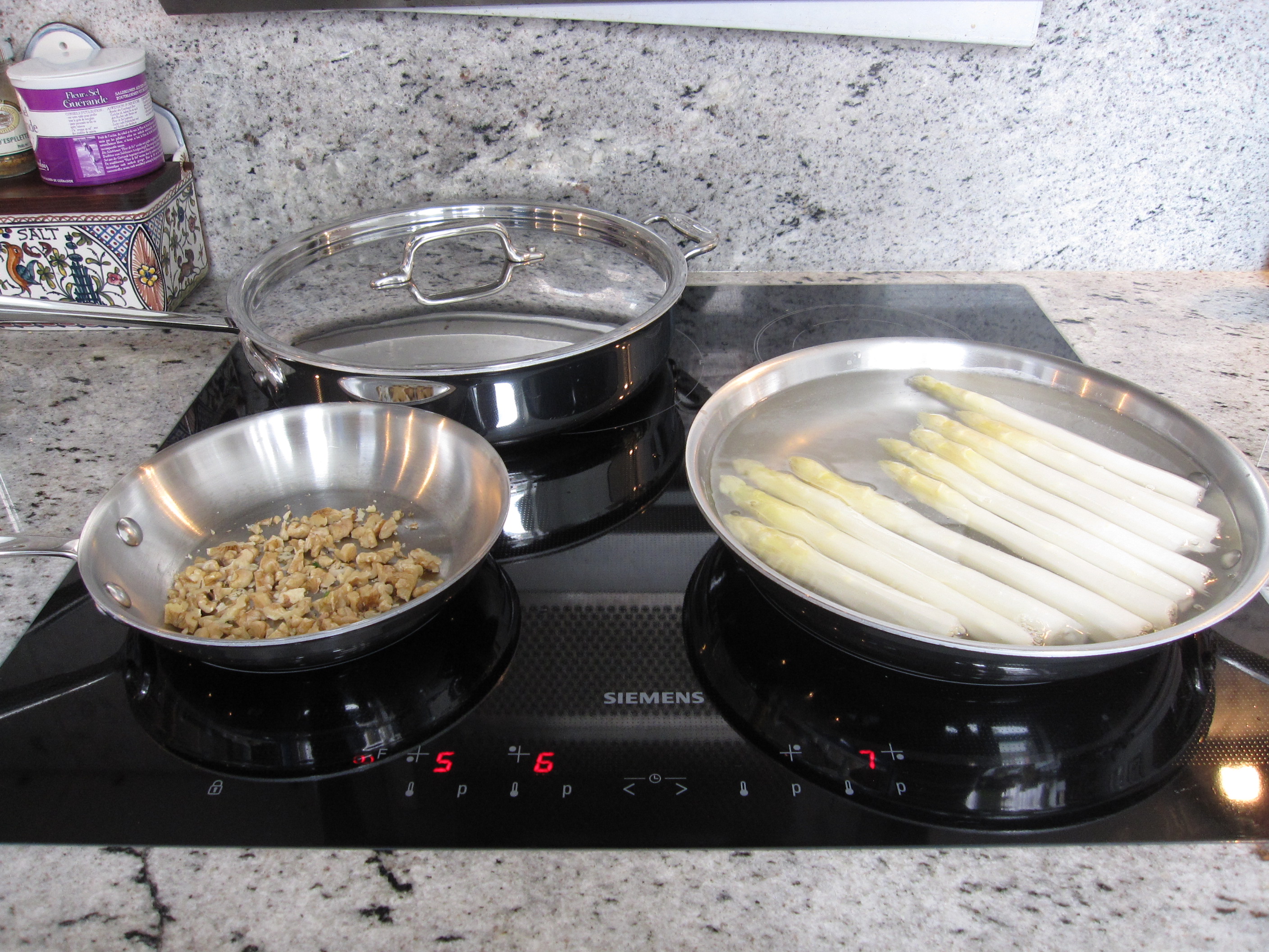 As for Dorie’s recipe, we have made this twice now and really enjoyed it both times. But both times I have also been amazed by how many pots & pans are required for a seemingly simple salad. Here is a shot of my stove in mid preparation; I’ve got asparagus cooking, walnuts toasting, and eggs poaching, and this doesn’t even include the pan for the bacon which I had already prepared earlier…