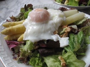 The Germans take their asparagus VERY seriously. It basically has its own season, which starts in early spring and lasts until the end of June. When local asparagus is at its peak, farm stands pop up all over the country for the sole purpose of selling asparagus, and every self respecting restaurant, from Michelin stars to corner pubs, produces an “asparagus menu” with various dishes featuring this most beloved veggie. But once the season is over, it’s really over, and no more will be seen until the following spring. Which is why I decided to tackle Dorie’s Bacon, Egg, and Asparagus Salad one last time before the season ends.