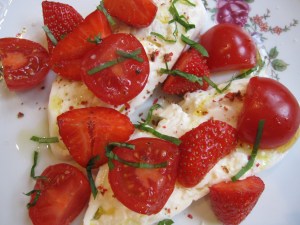 Today I am going to have to post and run, because in a few hours I will be boarding a plane for Chicago! Yes, I am homeward bound for a few weeks and I am really looking forward to it. I look forward to checking in later this week and seeing everyone else’s take on this week’s French Fridays with Dorie recipe, Mozzarella, Tomato, and Strawberry Salad.