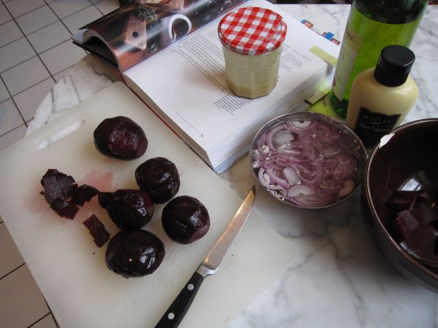 I know that I may be in the minority here, but for some odd reason I have always liked beets. Even as a kid when I probably should have known better. But there it is, I guess we all have our odd tastes. What I have never liked, however, is preparing them. They seem to take ages to cook and then they dye my hands and everything else they touch so that the whole kitchen looks like a murder scene. Since moving to Germany I have occasionally eyed the readily available pre-cooked beets at my local market, but had not until now tried them. For some reason they always looked a bit suspicious to me, but heck, if Dorie and Julia endorse them, who the heck am I to quibble!