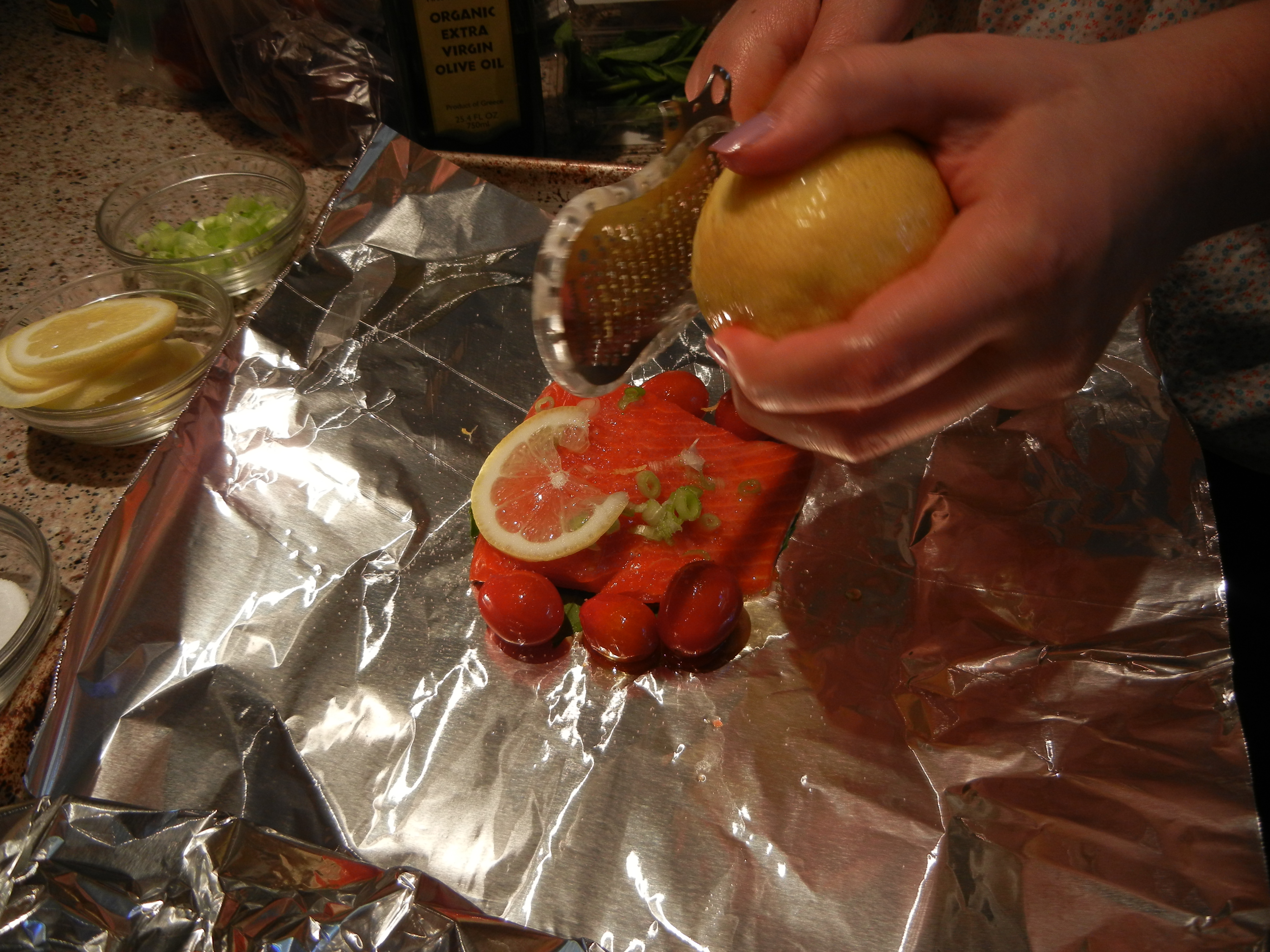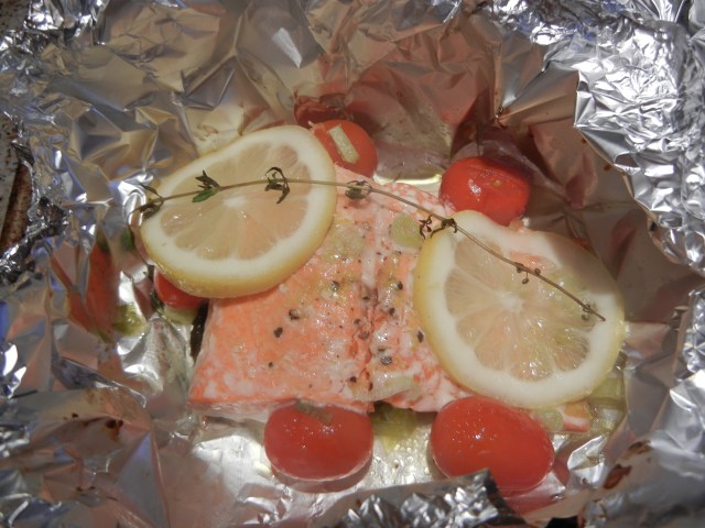 I am currently in Chicago and the whole family is buzzing with preparations as we get ready to celebrate my little brother’s upcoming wedding. In fact, I had previously thought that we would be too busy to participate in French Fridays with Dorie this week, but then we had one surprisingly quiet evening, and my husband and I volunteered to cook dinner for the family. So, with my father snapping pictures, we made Dorie’s Salmon & Tomatoes en Papillote.