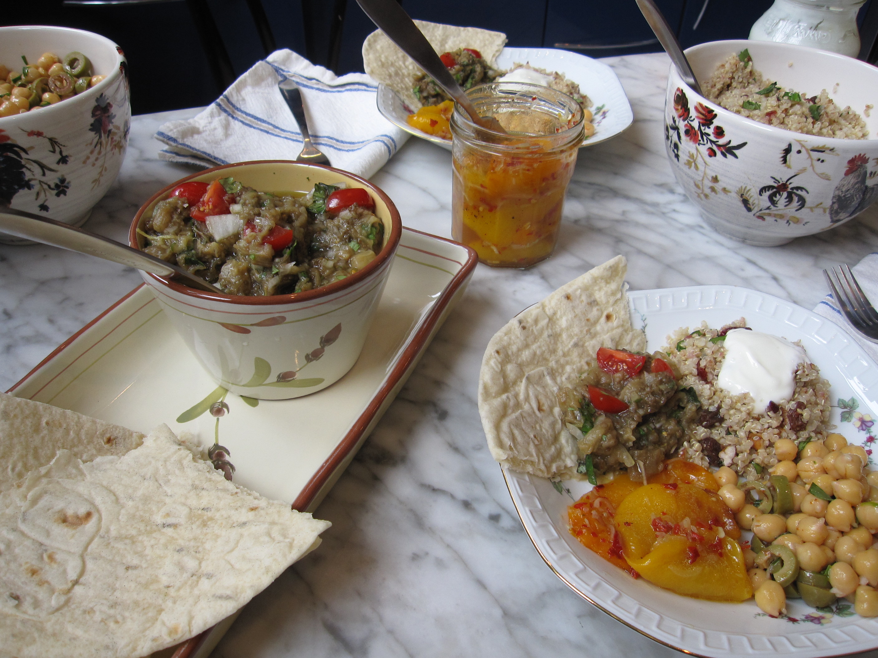 We served our eggplant caviar for dinner with some roasted peppers, chickpea salad, and Dorie’s quinoa. Leftovers were polished off at lunch the next day, as per Dorie’s suggestion, in sandwiches with goat cheese and roasted peppers.