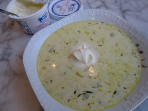 Your soup looks lovely against all that white. I bought creme fraiche at the supermarket for one of Dorie’s other recipes, and refuse to buy it again. It was a nasty, solid, rubbery brick, and I truly doubt it bears any resemblance to “real” creme fraiche, as it was nothing like Dorie’s description of it. It would never have swooped so nicely on top of the soup as yours did, so that just convinces me more that it was a bad version of it.