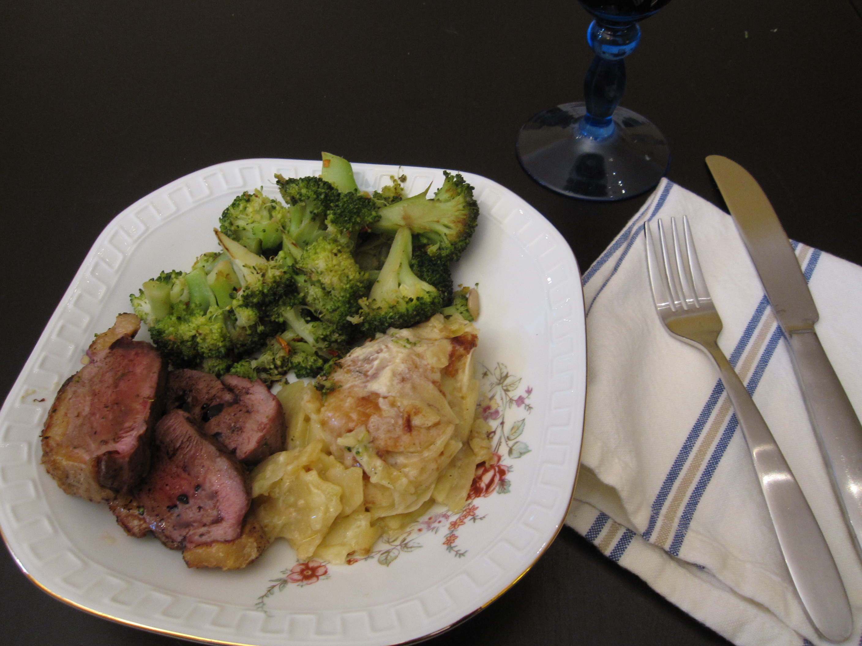 I don’t remember what the exact occasion was, but at one point last year I told my husband that he could pick out any menu which his heart desired and I would make it for him. His selection: “steak, potato gratin, chocolate cake, oh and I guess something green on the side.”