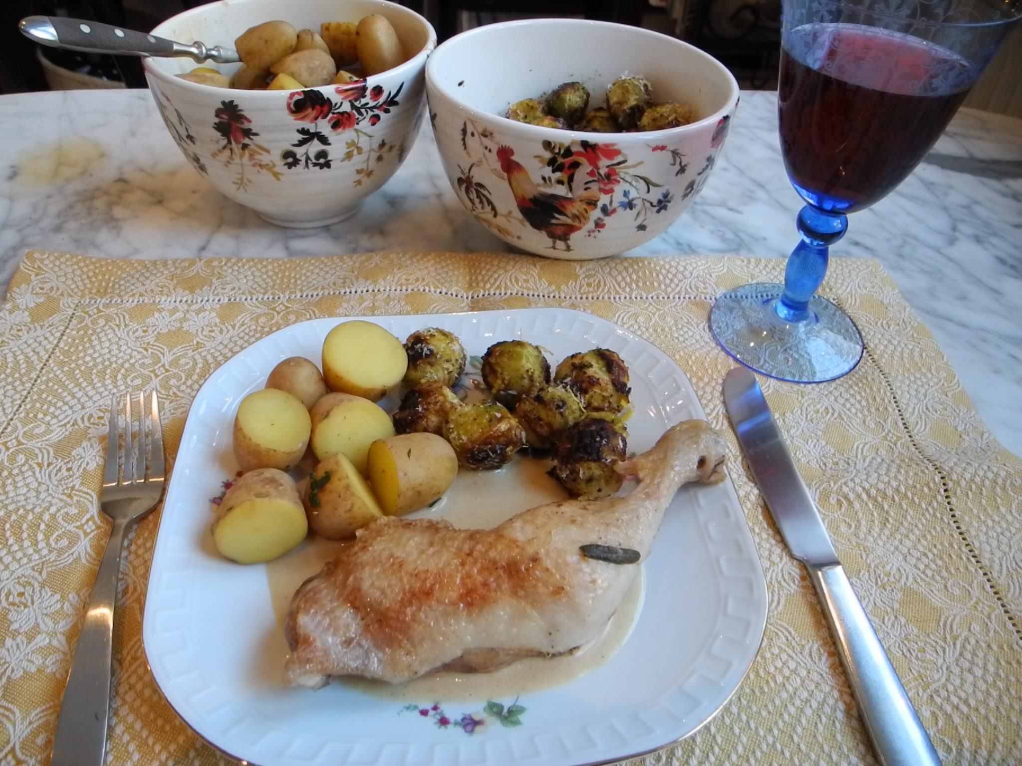 I decided to serve this week’s potatoes with two of the Food52 recipes which I have been eyeing, Chicken with Creamy Dijon Mustard Sauce and Grilled Brussels Sprouts (both recipes available on the Food52.com website). As a typical home cook, I tweaked both recipes just a little. In the chicken recipe I cut the oil and butter in half and for the brussels sprouts I doubled the amount of sprouts but left the rest of the ingredients alone (otherwise I think they would have been over spiced). I also threw them under the broiler instead of breaking out the grill in the middle of winter. Verdict? Both recipes were absolutely delicious and the sauce for the chicken was good enough to eat off a bumper!