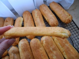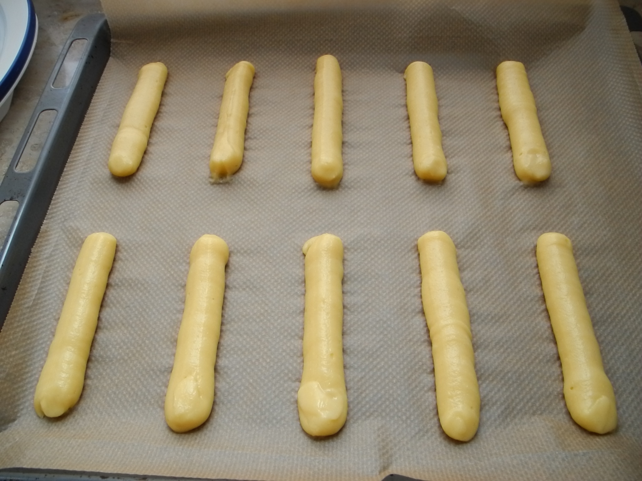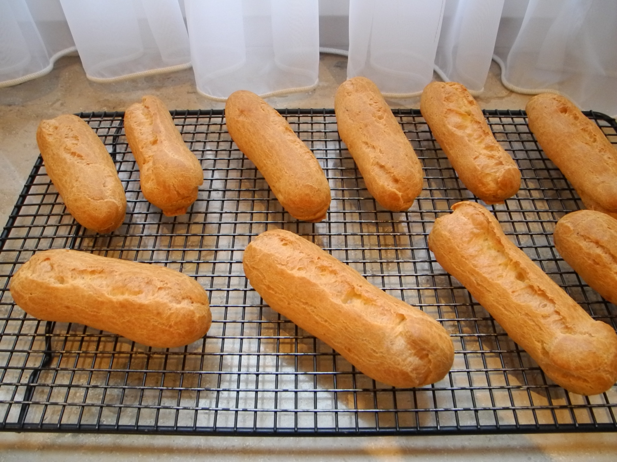 So, eclairs. When I try a new recipe for the first time, especially one as daunting as eclairs, I will often browse through my other cookbooks to gather more tips and do a little recipe comparison. Usually this exercise builds up my confidence, but this time what I found was a bit concerning. My trusty Joy of Cooking called for the eclairs to be baked a full 30 minutes longer in the oven than Dorie! What? How the heck can that be right? Or, more pertinently, which one was right? Well, Dorie’s recipe makes 20 eclairs and only 10 fit on my baking sheet, so what better time than now to do a little head to head recipe duel.