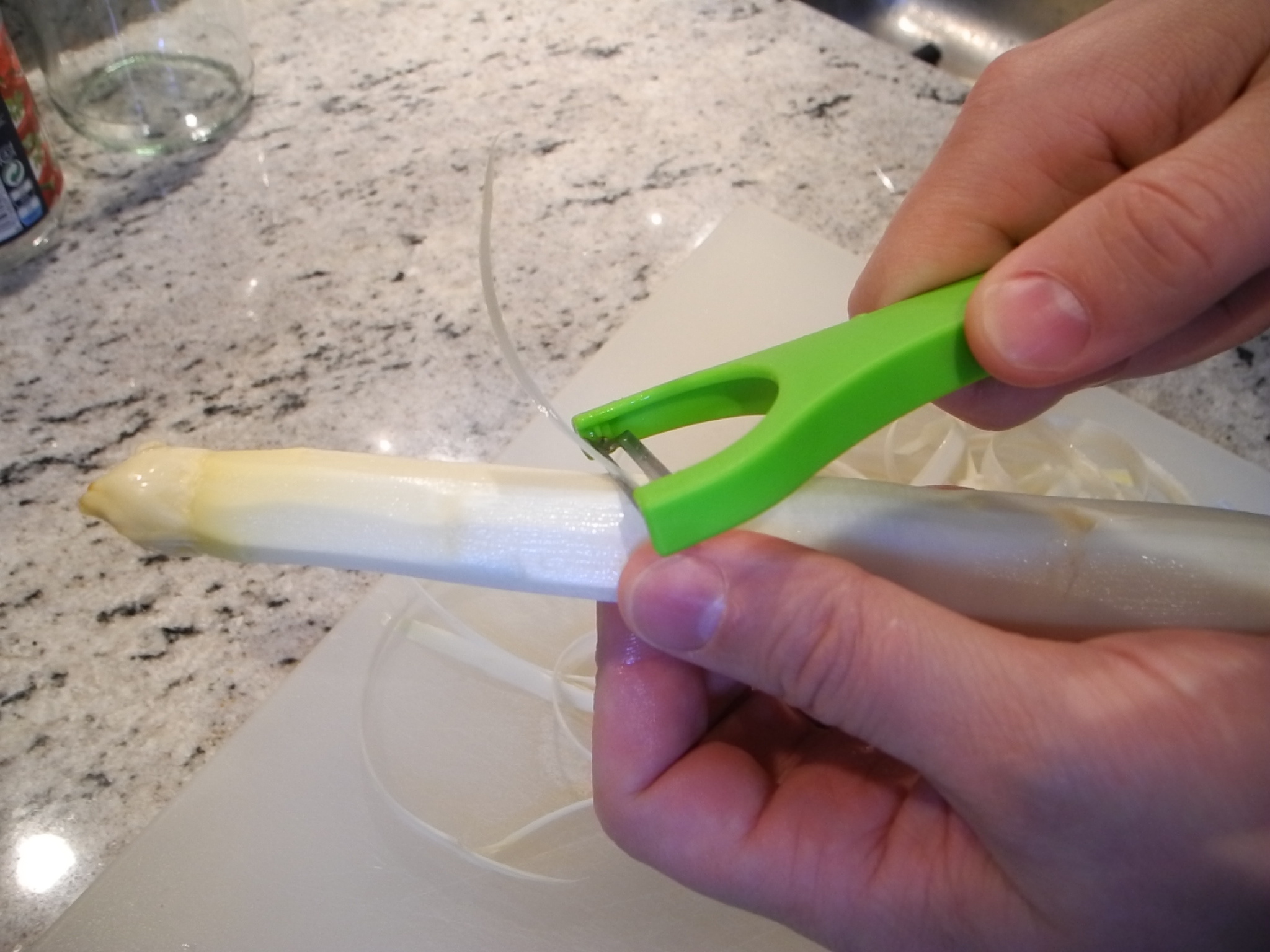 If you are unfamiliar with white asparagus, let me just tell you that it is a tad higher maintenance than green asparagus. To begin with, it has very tough skin and must be peeled before cooking. Luckily I was able to get the resident German to tackle that job for me. And then it needs longer to cook, my chubby spears took about 12 minutes.