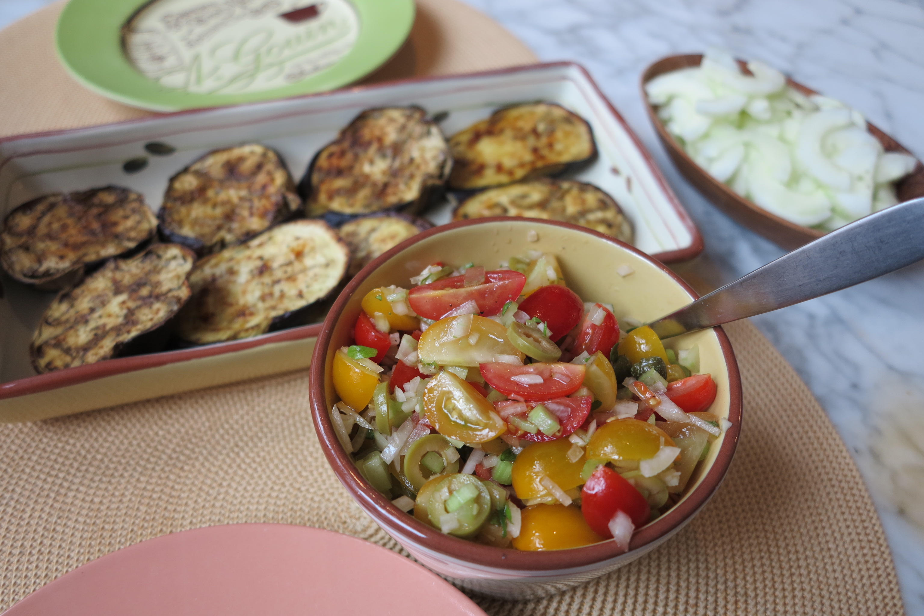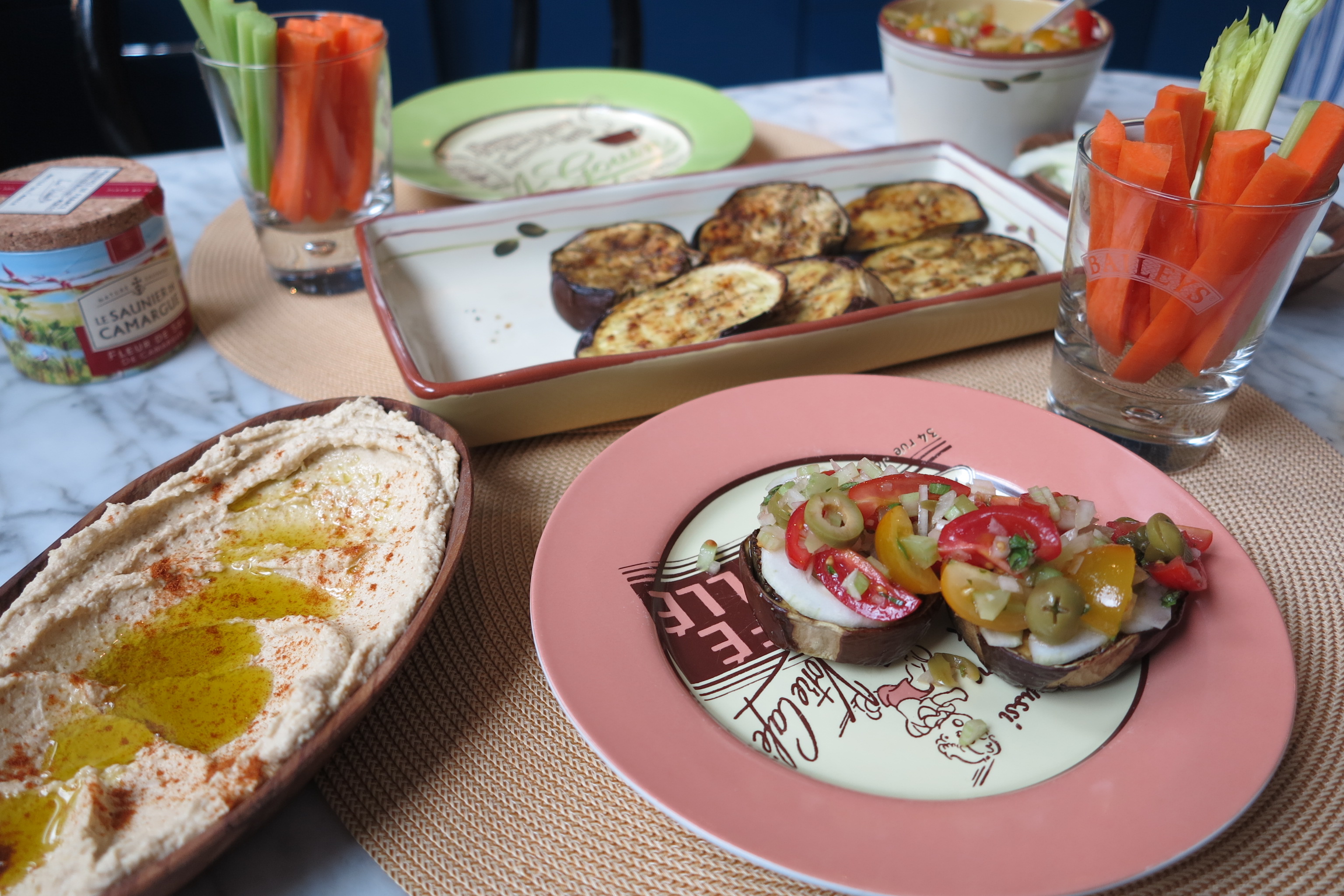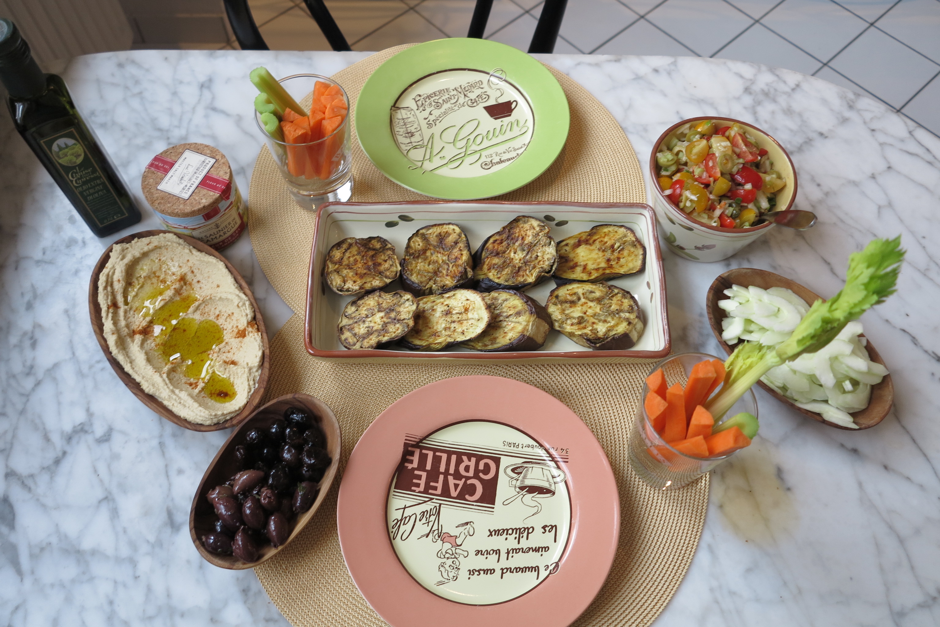 In trying to figure out how I was going to serve this week’s French Fridays with Dorie recipe, Hummus, I remembered that I recently missed another recipe which might go nicely, namely the Eggplant Tartine. Heck, throw some olives in and call it mixed antipasti I say.