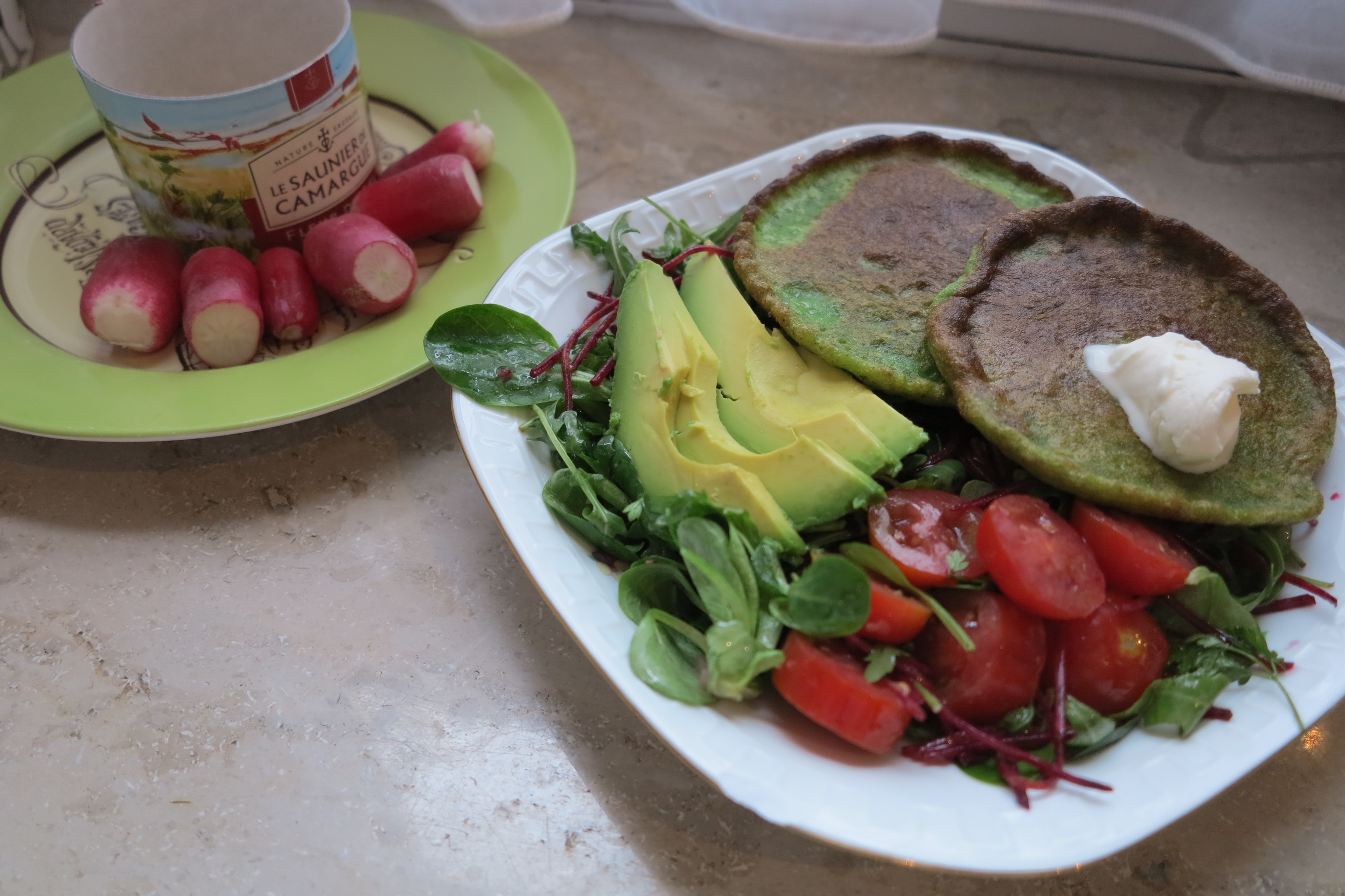 I fried up my pancakes and served them with a fresh salad and a dollop of creme fraiche. All of which may sound very healthy, but my pancakes seemed to be awfully greasy, despite all the paper towels I went through trying to soak up the oil. Possibly I didn’t turn up the heat high enough. Whatever it was, these were sadly not a hit.