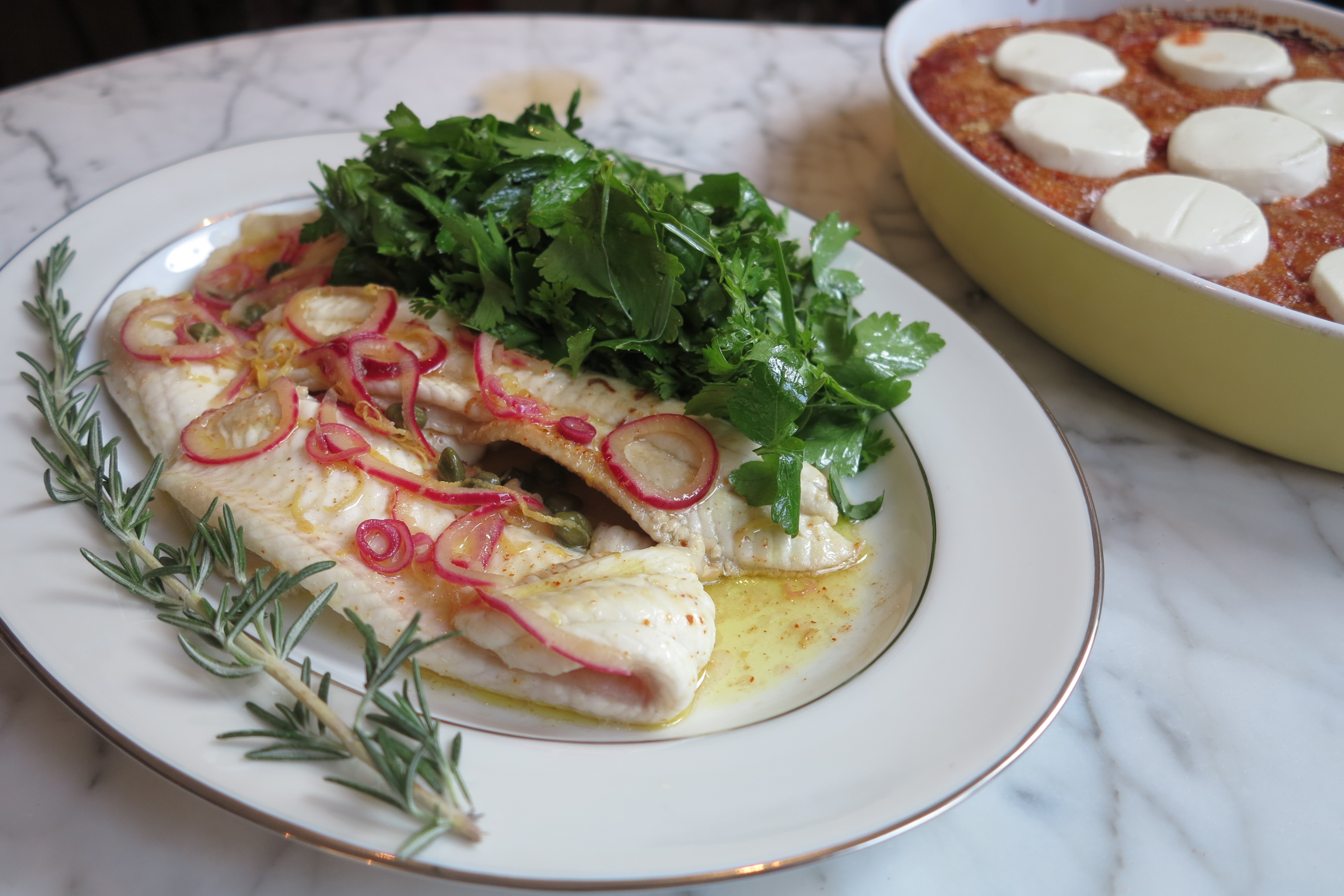 What can I say? Dinner was absolutely delicious. I loved Dorie’s fish preparation and will definitely try this recipe with other types of fish in the future. And the tomatoes paired surprisingly well with the firmer fish (whatever it was) and I have been happily dipping into the leftovers ever since. All in all, a success!