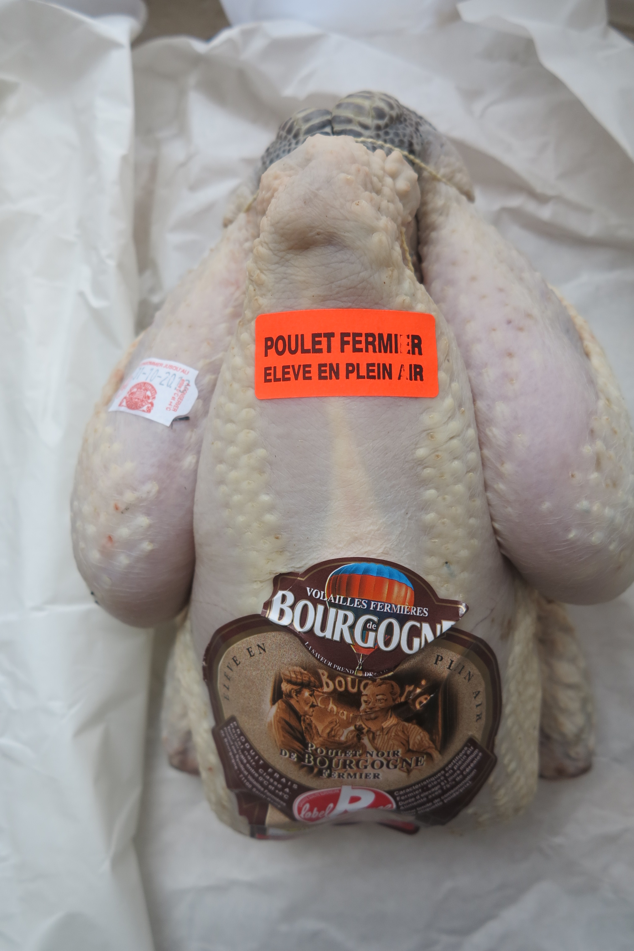 FFwD202 174Dorie introduces this recipe by pointing out that France is the land of pedigree chickens. So off we set to the market to see if we couldn’t find a well bred bird. Which of course led to the question, why do French chickens always come with their feet (or at least part of their feet) still on? My research is inconclusive, but yielded two interesting theories. Theory 1 is that it is proof of pedigree. Not knowing much about the difference in pedigrees, this doesn’t help me much. Theory 2 is that it is somehow a sign of freshness because the feet will change color as the bird ages. But again, since I have no idea which color to look for, this is also not much help. If you know the truth, please share.