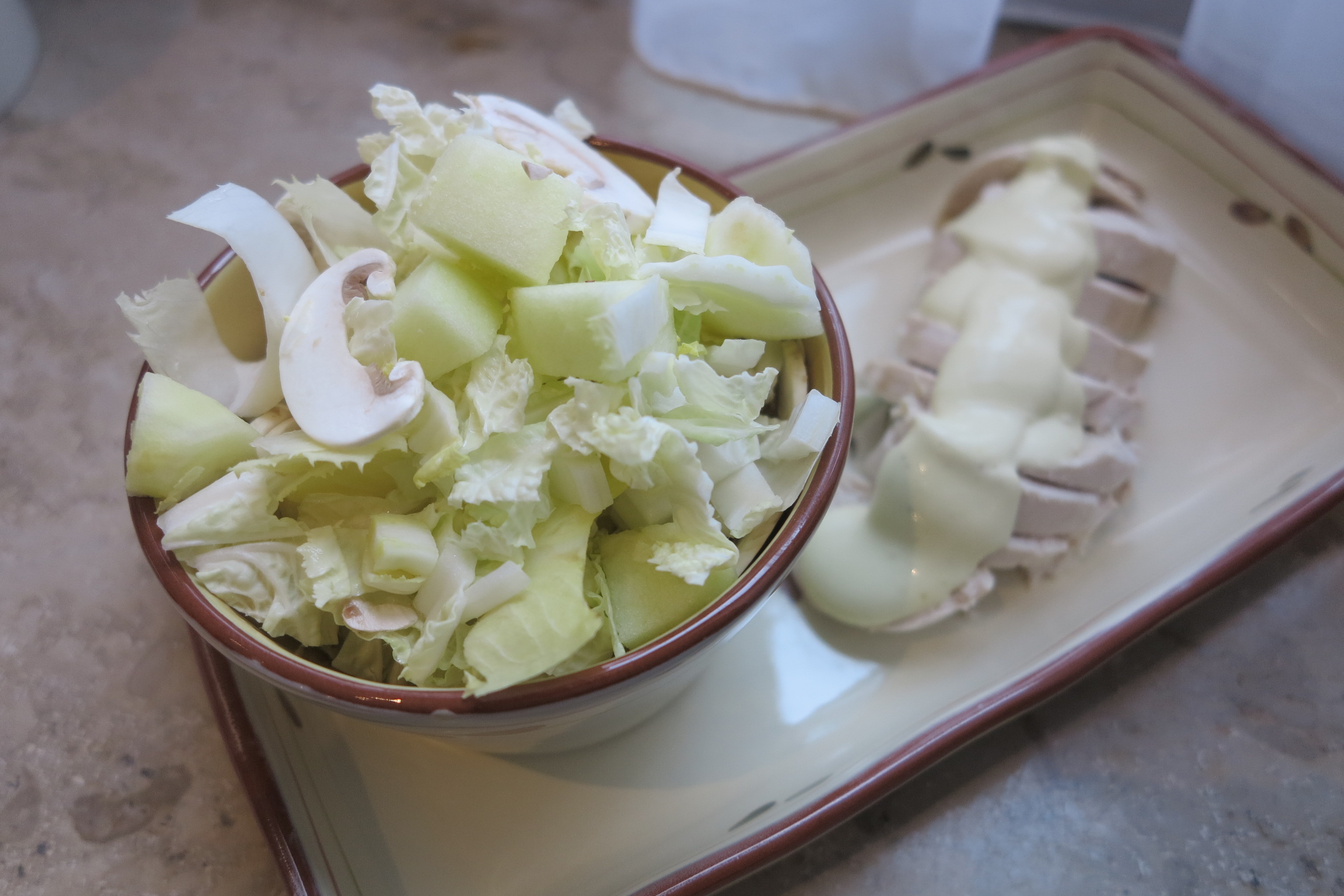 In order to make the salad more husband-compliant, I used endives instead of the dreaded celery and added a poached chicken breast to beef it up a bit. Still white-ish and still delicious. Even the husband thought so.