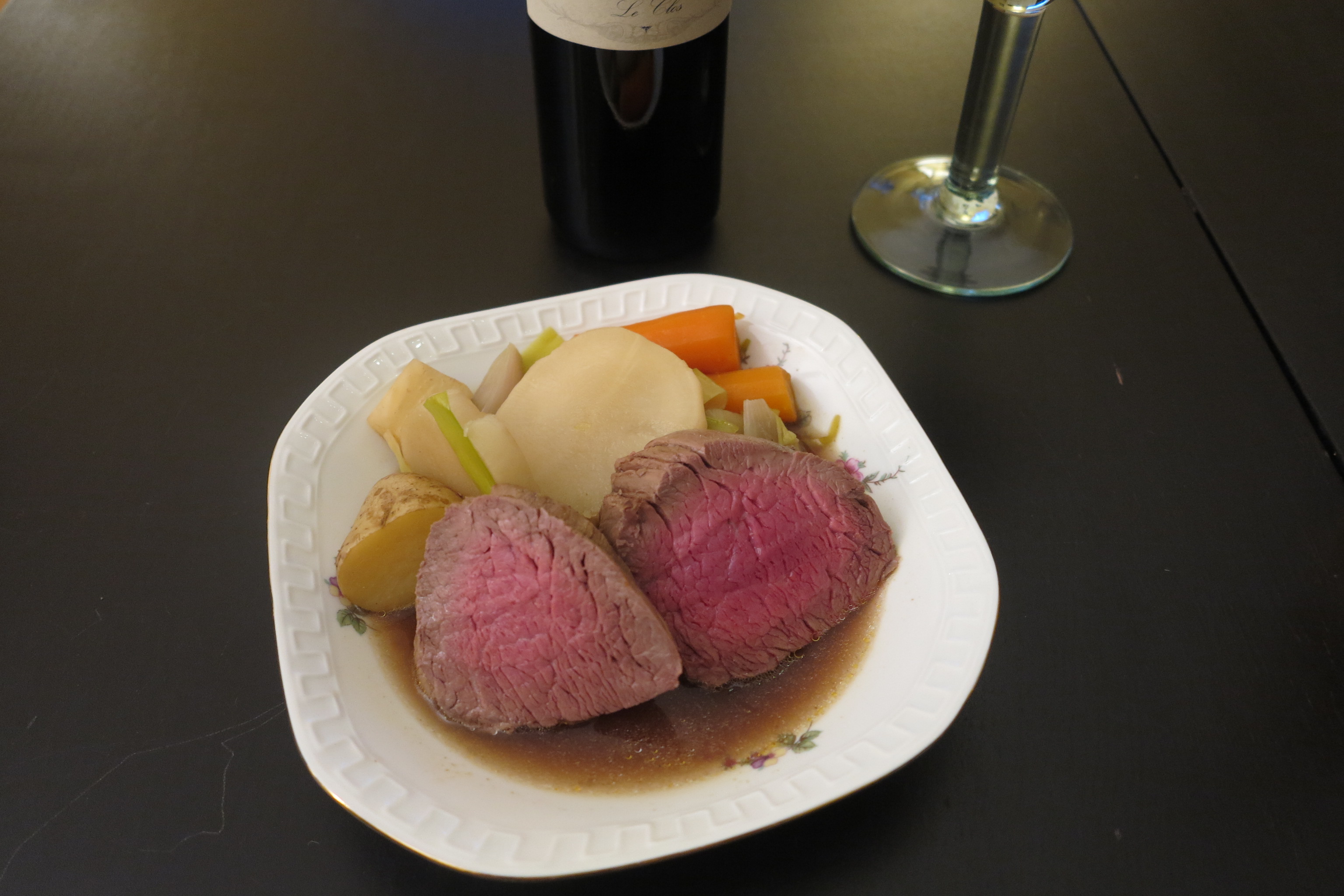 The prep for this one made the crepes look easy by comparison. First we had to make our own beef broth. Mine was a bit bland because my bones didn’t have much marrow in them and I had to beef it up a bit (no pun intended) with some demi glace. Next time I’ll either pay closer attention or take the lazy route and buy some at the store. Next, we cooked a pile of veggies and finally a full beef tenderloin in the broth. The whole idea sounded weird. Really weird.