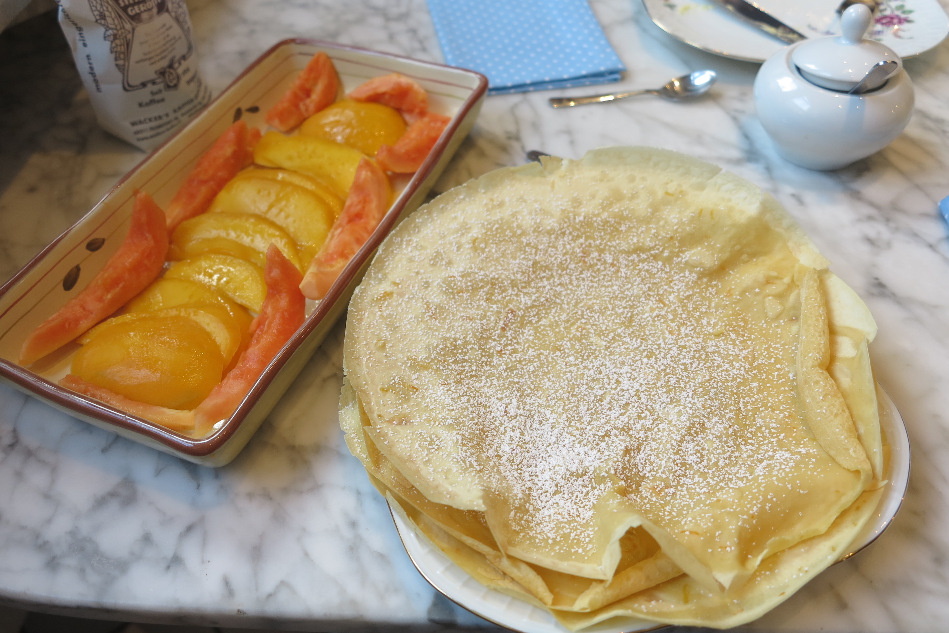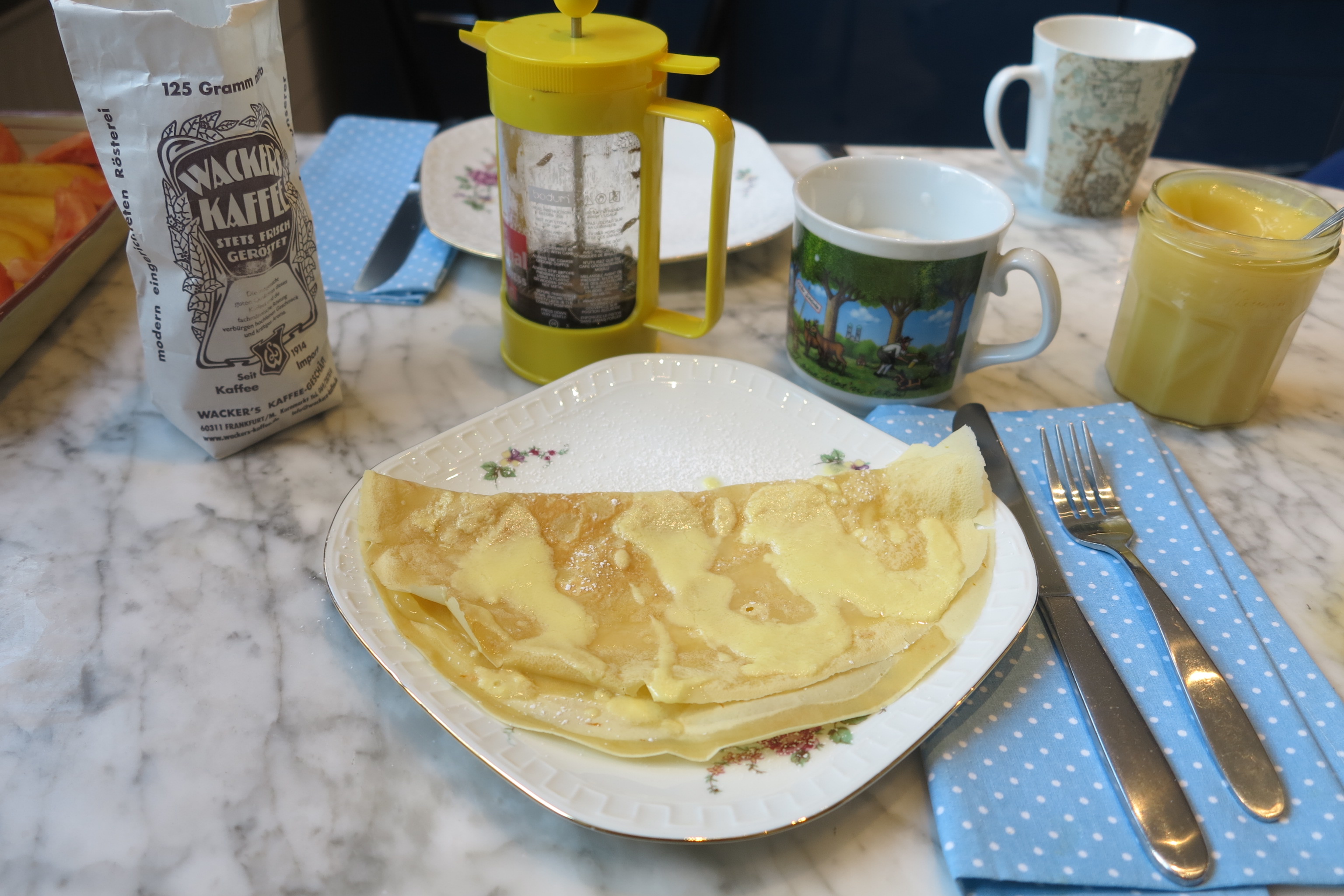 First up, this past week’s recipe, Butter and rum Crepes. Now, maybe it’s the Vermonter in me, but I’m a bit of a purist when it comes to pancakes. Butter and maple syrup is the gold standard (real maple syrup in case there was ever any question). I occasionally enjoy nuts or fresh fruit thrown into the mix. And my favorite crepe topping is sugar and fresh lemon juice. It may not stand out to you when reviewing the menu at a crepe stand (my husband usually goes for nutella), but I assure you that it’s delicious. All of those fussed up custard filled this and chocolate & ice cream topped that, doesn’t interest me at all. It’s breakfast, not a bloody ice cream sundae.