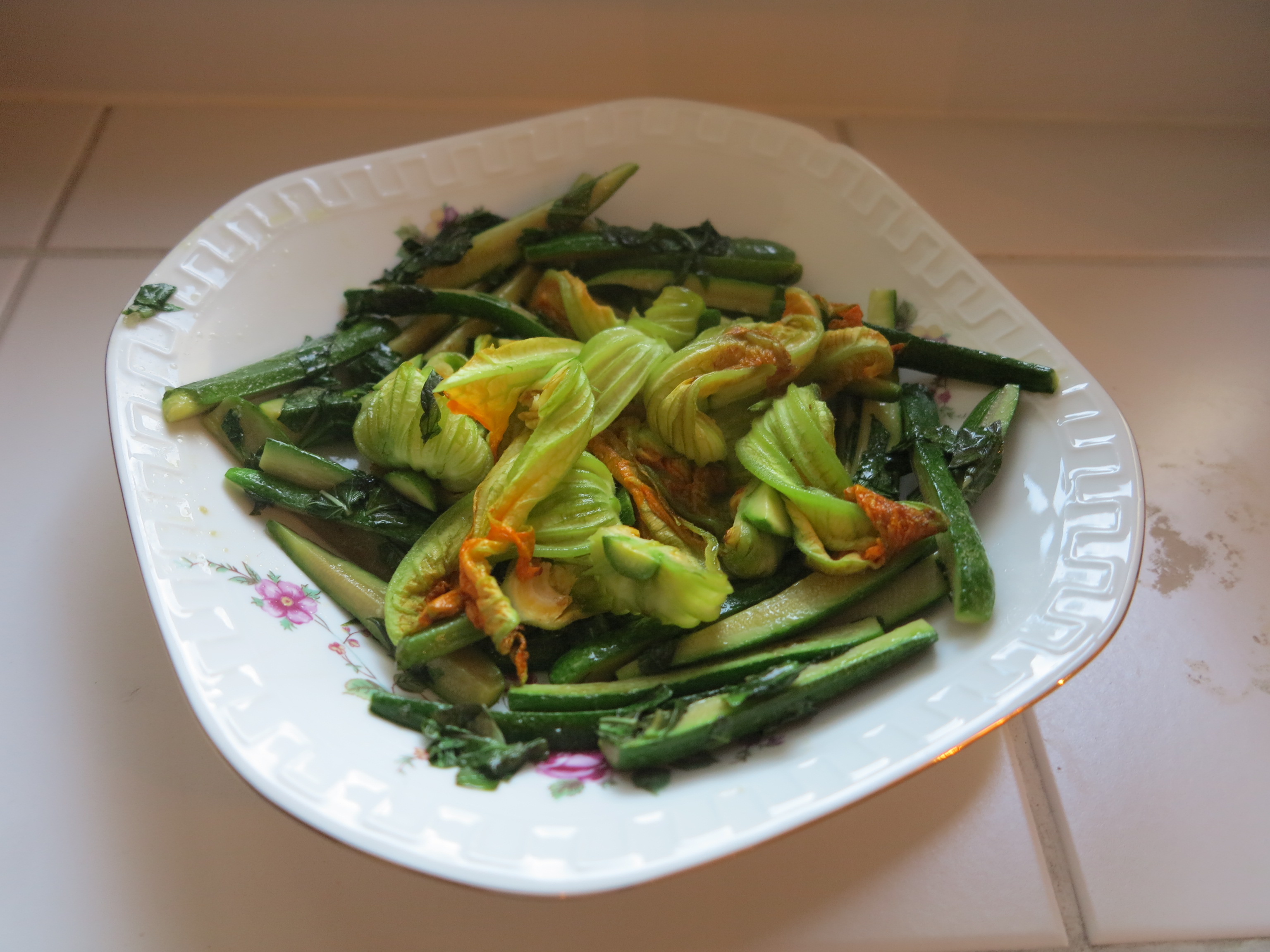 And since in my nervousness I had bought way more zucchini blossoms than needed (I was picturing myself having to throw away at least half of them) I had plenty leftover the next day, which I sautéed up with a little butter and fresh basil leaves. Also delicious! I will now be keeping an eye out for these delicacies each summer.