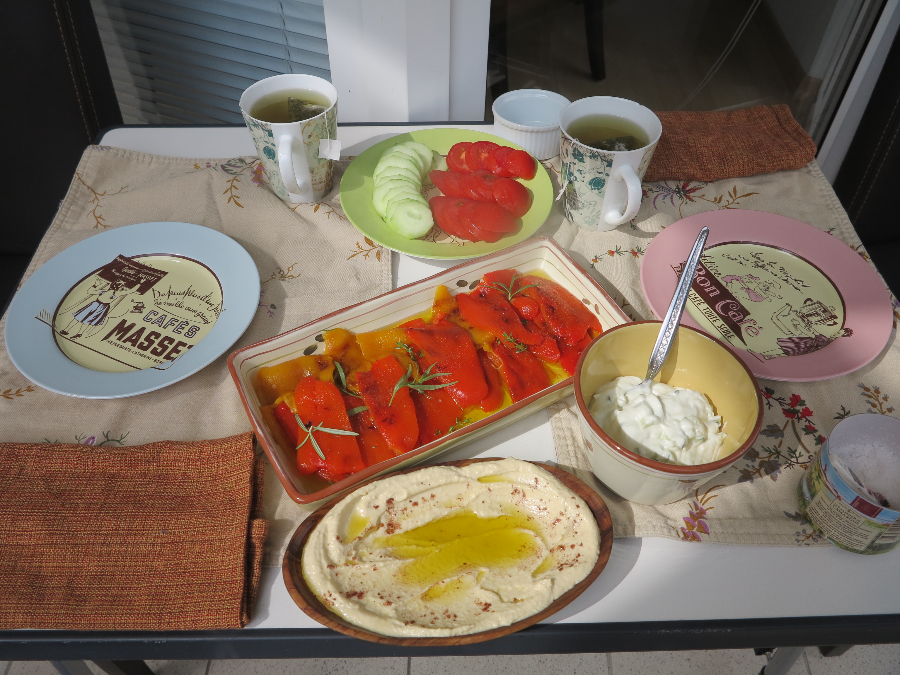 Looks like a lovely meal. I love hummus. I make my peppers on the grill too and don’t bother to peel the skin. Dorie’s recipe was too fussy for me. I loved the couscous salad and I made half a recipe. It did make a lot. Enjoy the fall weather. Summer is still raging in California.