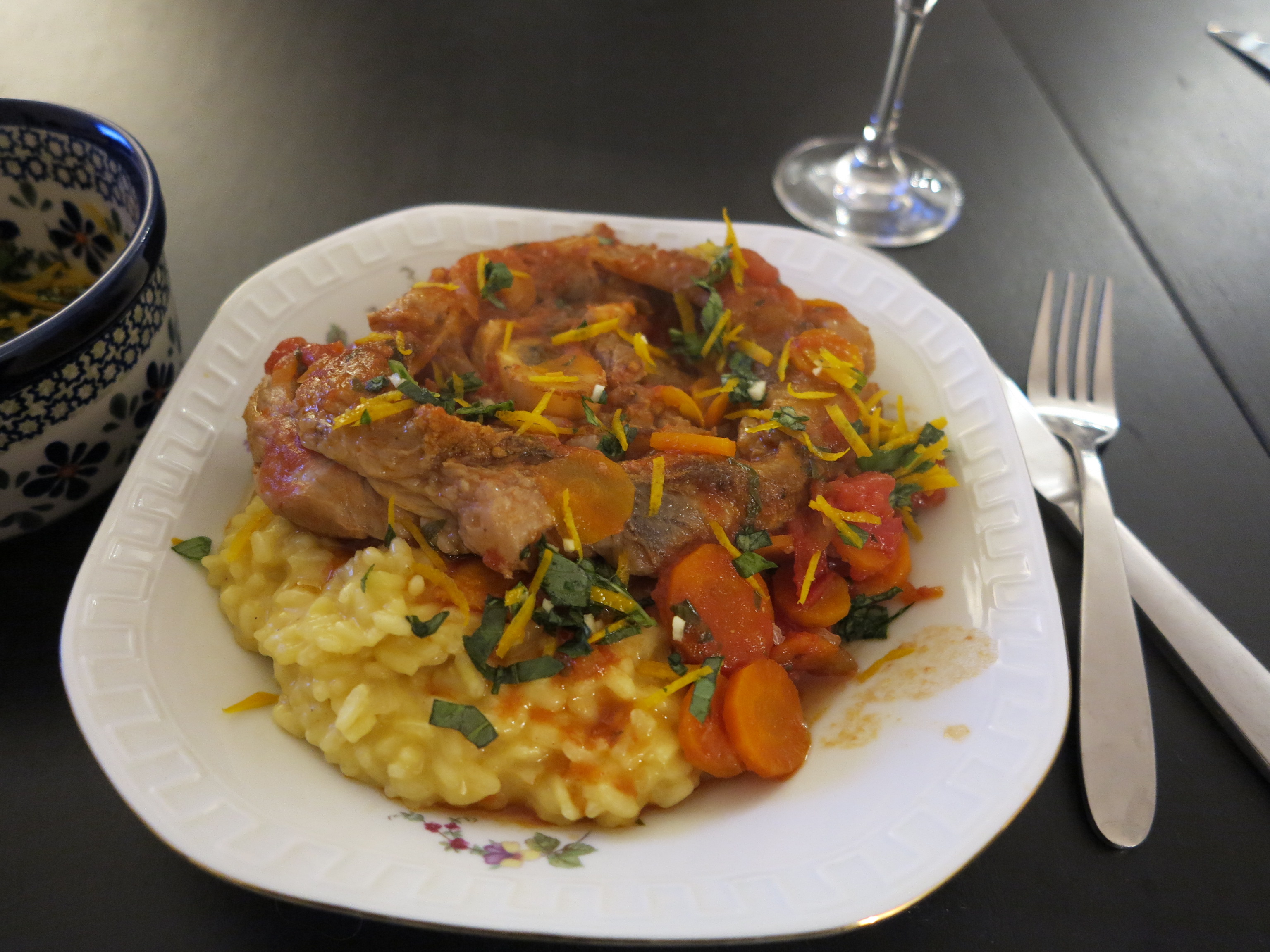 Which brings us to this week’s recipe, Osso Buco a l’Arman. Dorie writes that the traditional accompaniment for osso buco is saffron risotto. Who am I to argue with tradition? Besides, it’s ben an awfully long while since I’ve made risotto and it gave me something to do while the main was loitering in the oven. Our resulting meal was delicious. I enjoyed the sauce with my risotto, my husband loved the osso buco and commented on it several times as being “really good!” and we both thought that the gremolata was a nice touch.