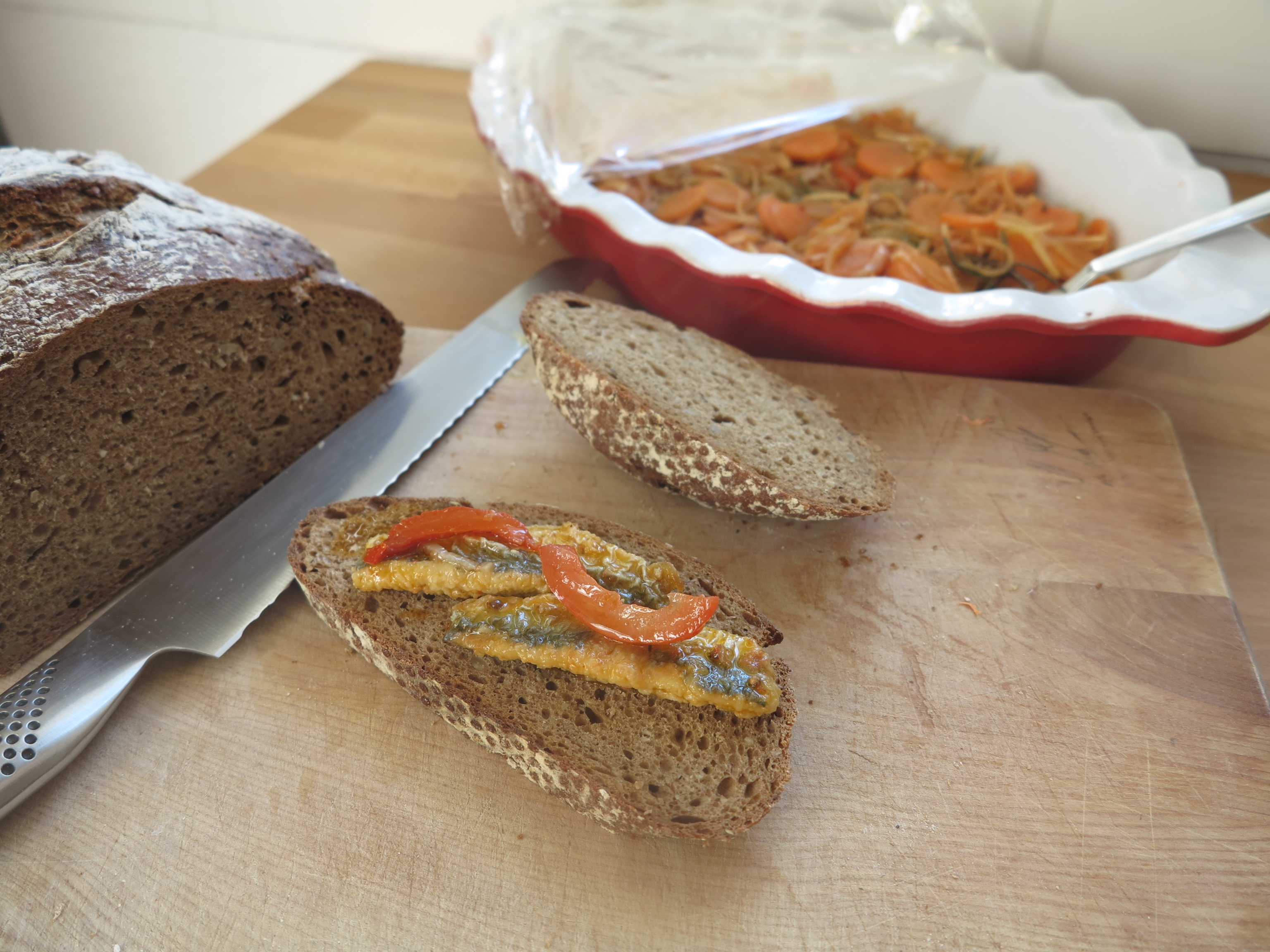 I had to do my own fillet-ing (what a nice husband you have!), but I only bought three sardines so it wasn’t too bad. I love the look of your sardines on that tasty-looking bread!