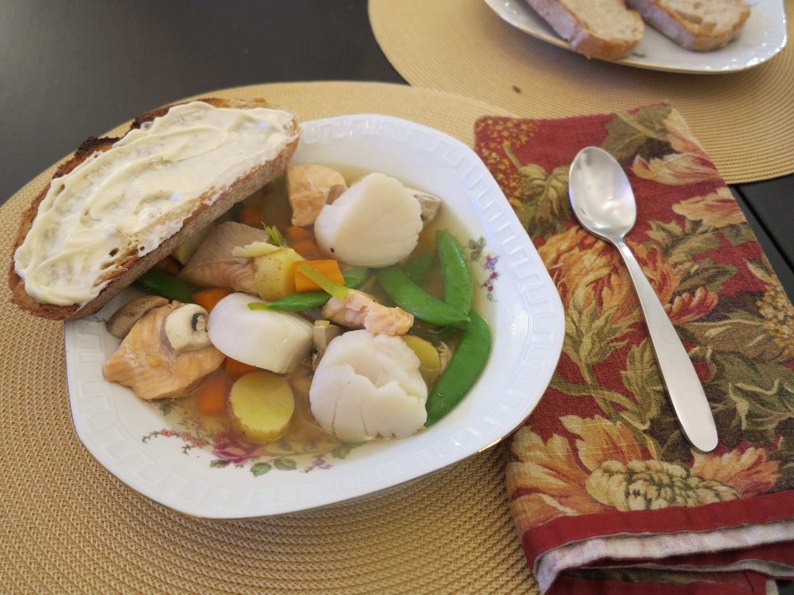 This time around Dorie has us making Seafood Pot au Feu. Like her Warm Weather version, this one has us layering the flavors into the broth by adding the ingredients one at a time. I halved the recipe and couldn’t find any mussels (not that I looked particularly hard), but otherwise followed Dorie’s instructions. Okay, okay, if I’m really being honest, I also used store-bought aioli. Hey, it was a busy week!