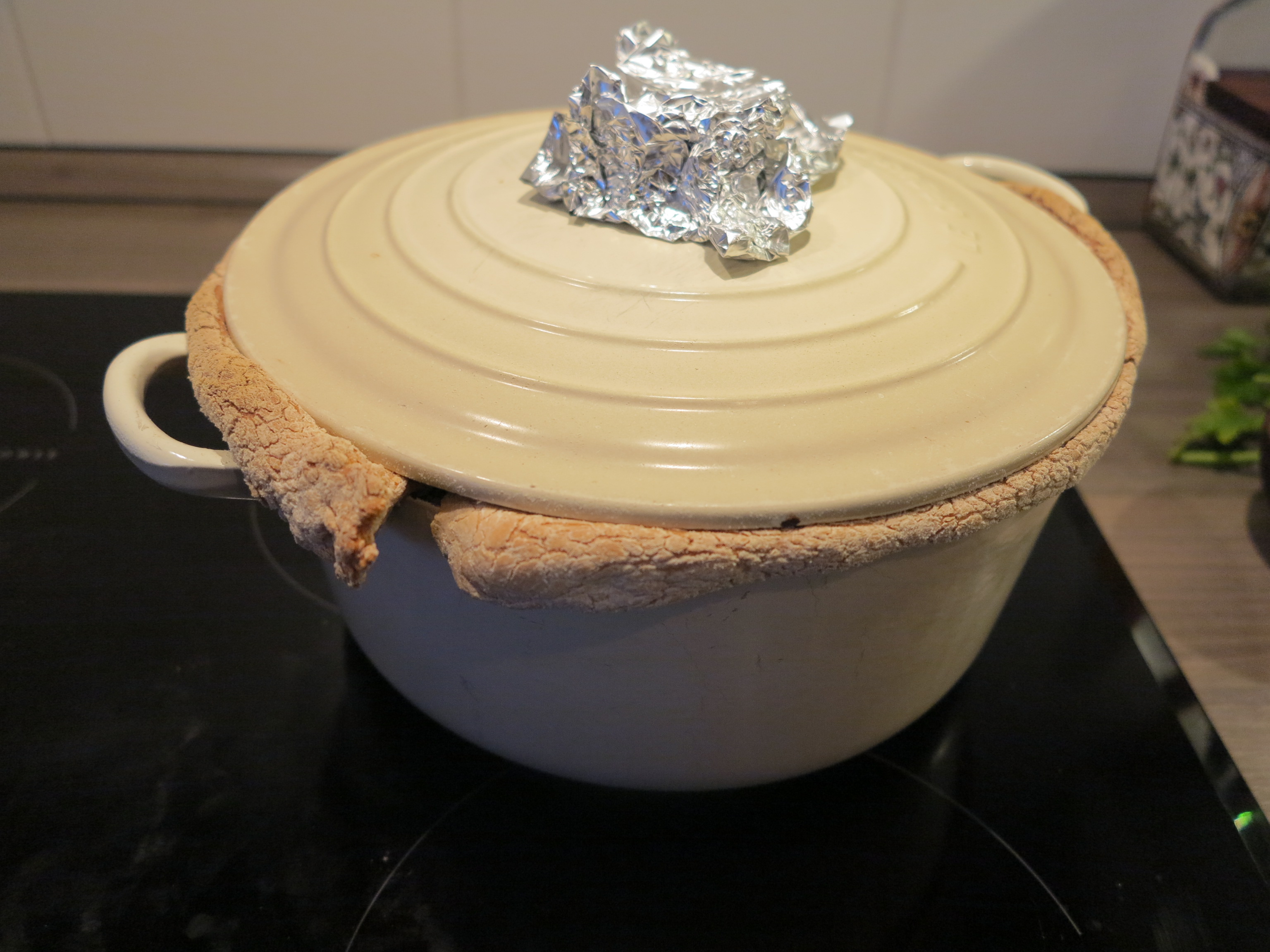 As you can see, my supposedly airtight seal sprang a leak, but otherwise this recipe came together as promised. The chicken was juicy and delicious and with the veggies thrown in, made for a wonderful one-pot meal. I did find that browning the whole chicken was a bit unwieldy, and would likely stick with chicken pieces in the future. Otherwise, this was a fun recipe and a new technique to add to my arsenal.