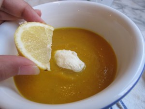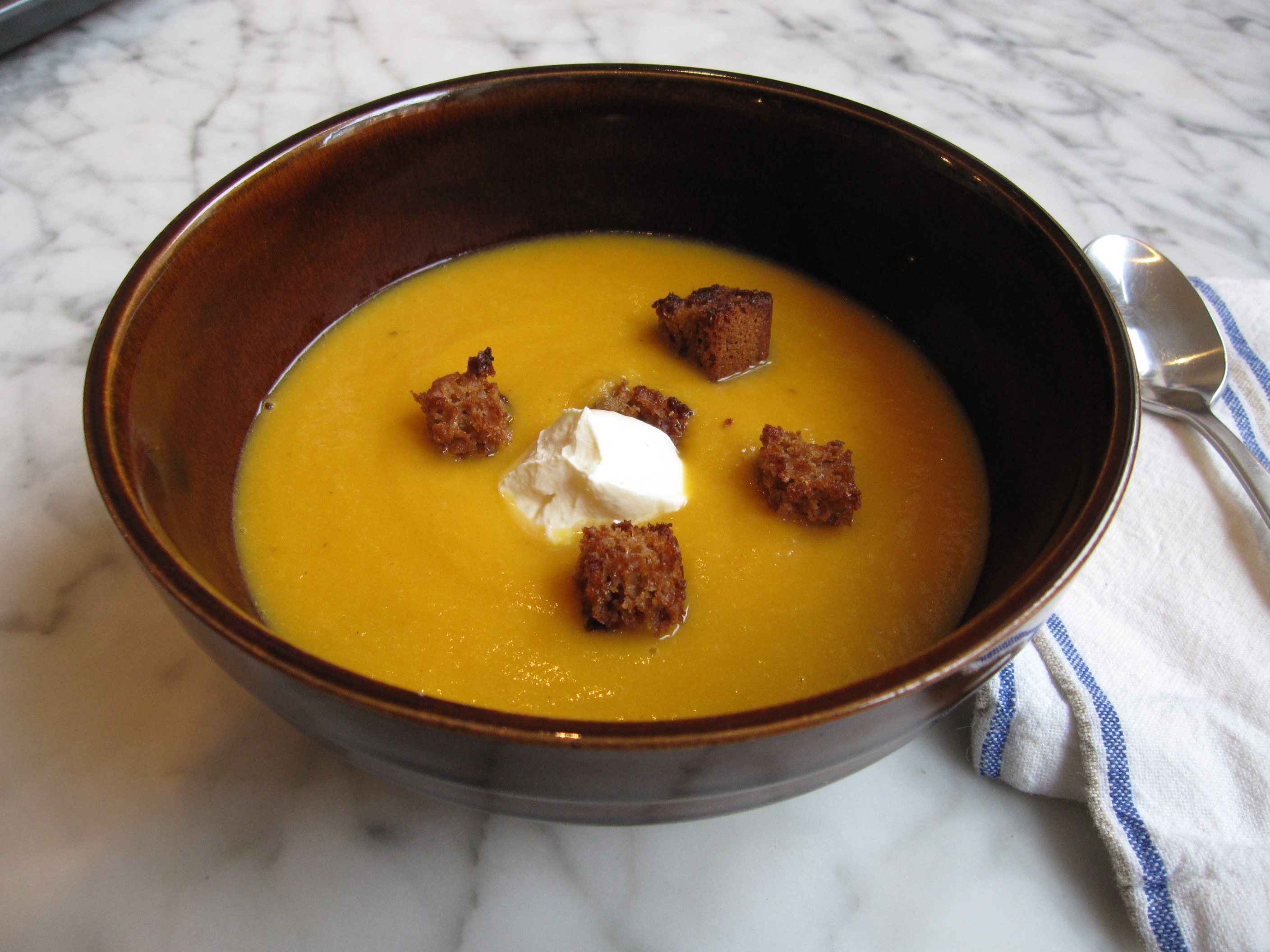 It’s that time of year once again, time to take the ice cream maker out of the freezer and start stocking up on soup for those cold winter days when I’m too lazy to cook. I love soup and it is one of my favorite winter meals. It’s just so warming and comforting and (usually) nutritious. It is also one of the few recipes which I never half or quarter, regardless of how many servings it makes. Instead I make the full batch and freeze the leftovers. And this week’s French Fridays with Dorie recipe, Spiced Squash, Fennel, and Pear Soup is officially the first soup to move into my freezer this season. I’m a little happier just knowing it’s there!