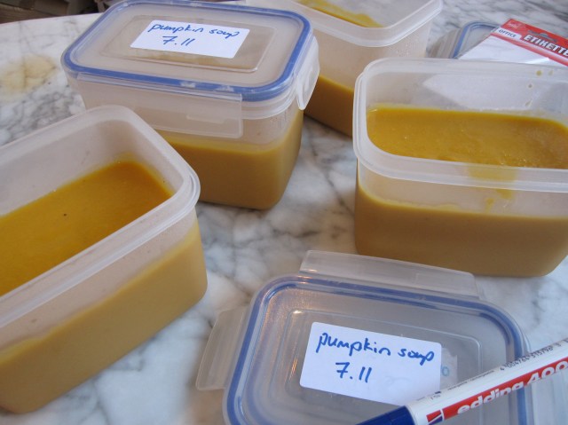 This week’s recipe was also a reminder of why I love my local produce stand so much. All over Germany we have these ubiquitous little outdoor produce stands which are neither grocery store nor farm stand. In the main square near my apartment are three such stands, none of which ever seems to be hurting for customers. The owners of these stands are not farmers, but instead source their produce from various distributors, depending on the season. What I love about these stands (or at least what I love about my stand) is the level of service. The guys who work there really know their stuff and are always willing to provide a helpful tip or give you a taste of something. And what I really love is that, unlike at the grocery store, I can buy as little or as much of each item as I need. If I need one stalk of celery and not an entire bundle, I can buy one stalk of celery. If Dorie’s recipe calls for 1.5 kilos of pumpkin, but the smallest pumpkin available is 4 kilos, all I have to do is ask and they will cut me off a piece exactly the size I need and wrap up the rest to sell to the next customer. No need to worry about figuring out what to do with all that leftover pumpkin!