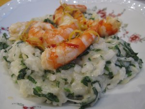 Let me start at the beginning. This week’s recipe is Creamy Cheesy Garlicky Rice with Spinach (talk about a mouth-full) and after some internal indecision over how to serve this, I decided to call it french risotto and serve it as a main dish instead of a side. And to spruce it up a bit, top it with some sauteed shrimp.